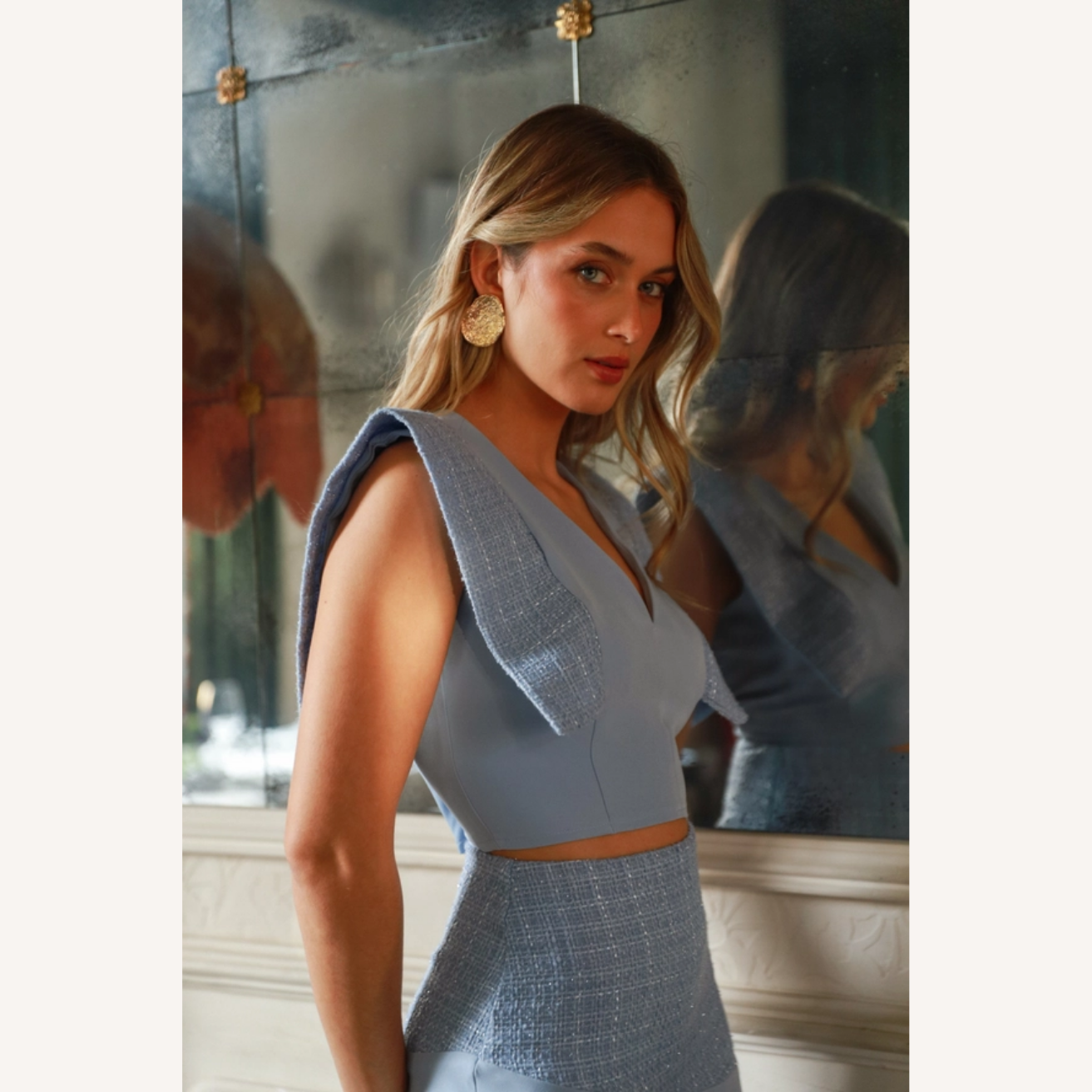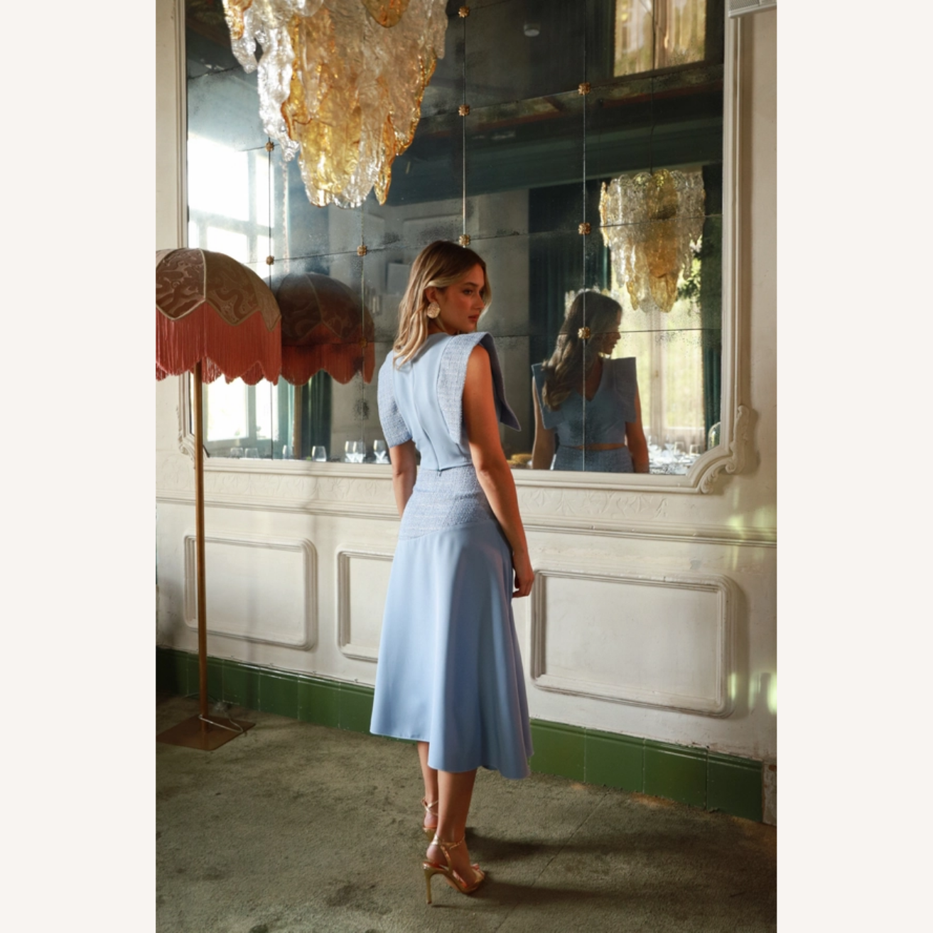 Top and flared skirt set in a combination of Chanel fabric and sky blue bioelastic.